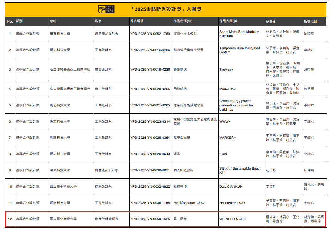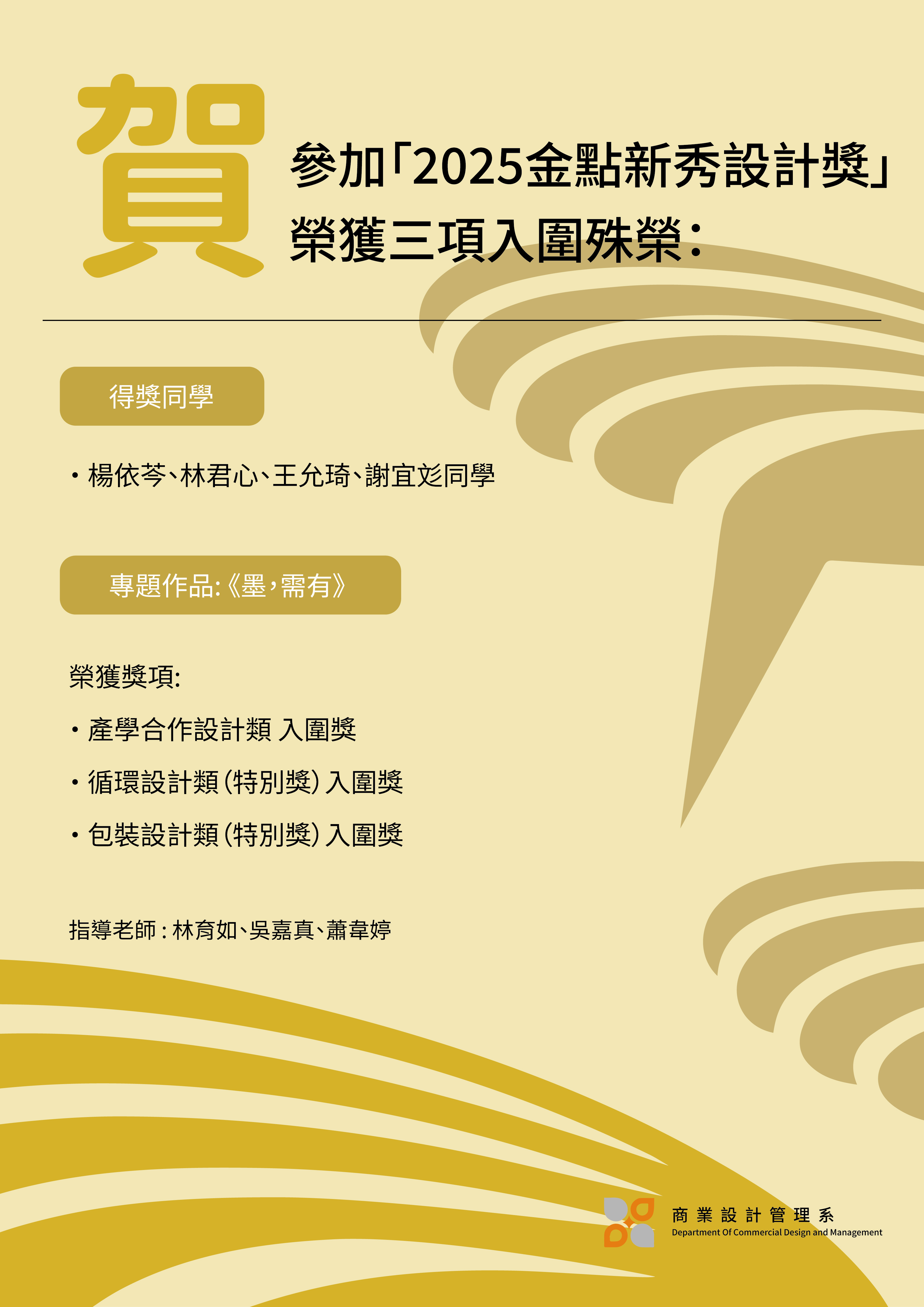 【賀】本系同學以專題作品《墨,需有》參加「2025金點新秀設計獎」,榮獲三項入圍殊榮: