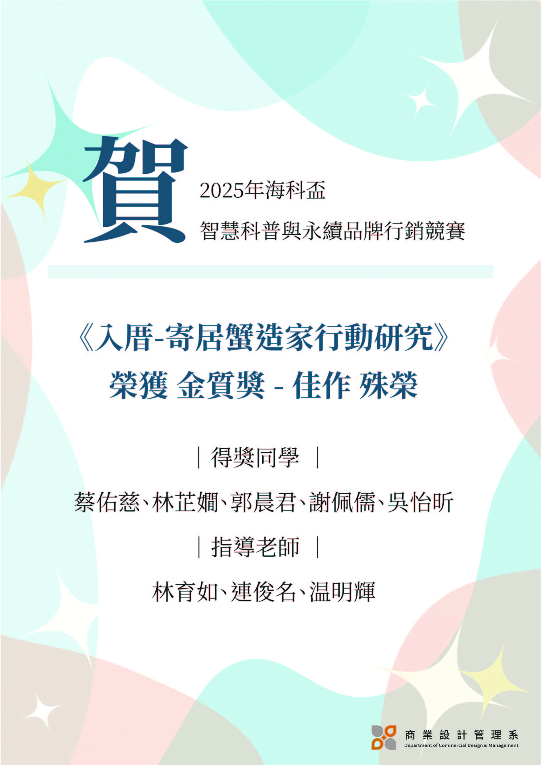 【賀】本系《入厝-寄居蟹造家行動研究》參加 2025「海科盃」智慧科普與永續品牌行銷競賽 榮獲 金質獎-佳作