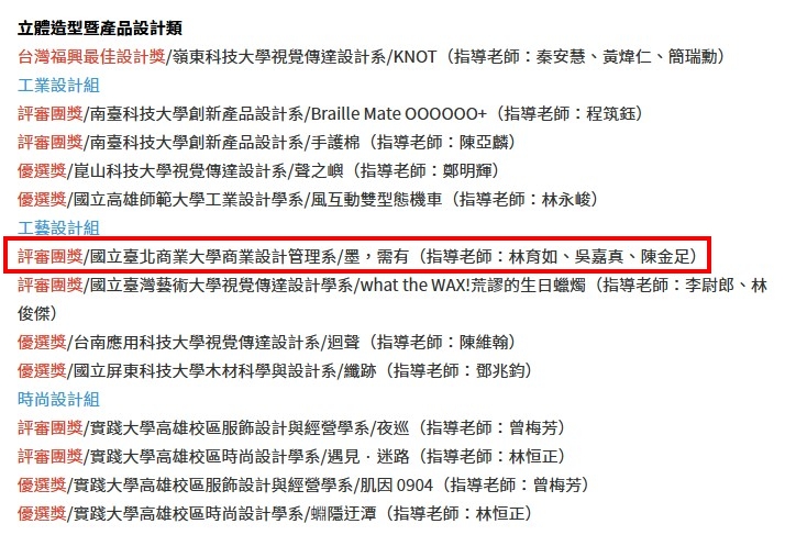 四技應屆畢業生 獲青春設計節 立體造型暨產品設計類-工藝設計組-評審團奬