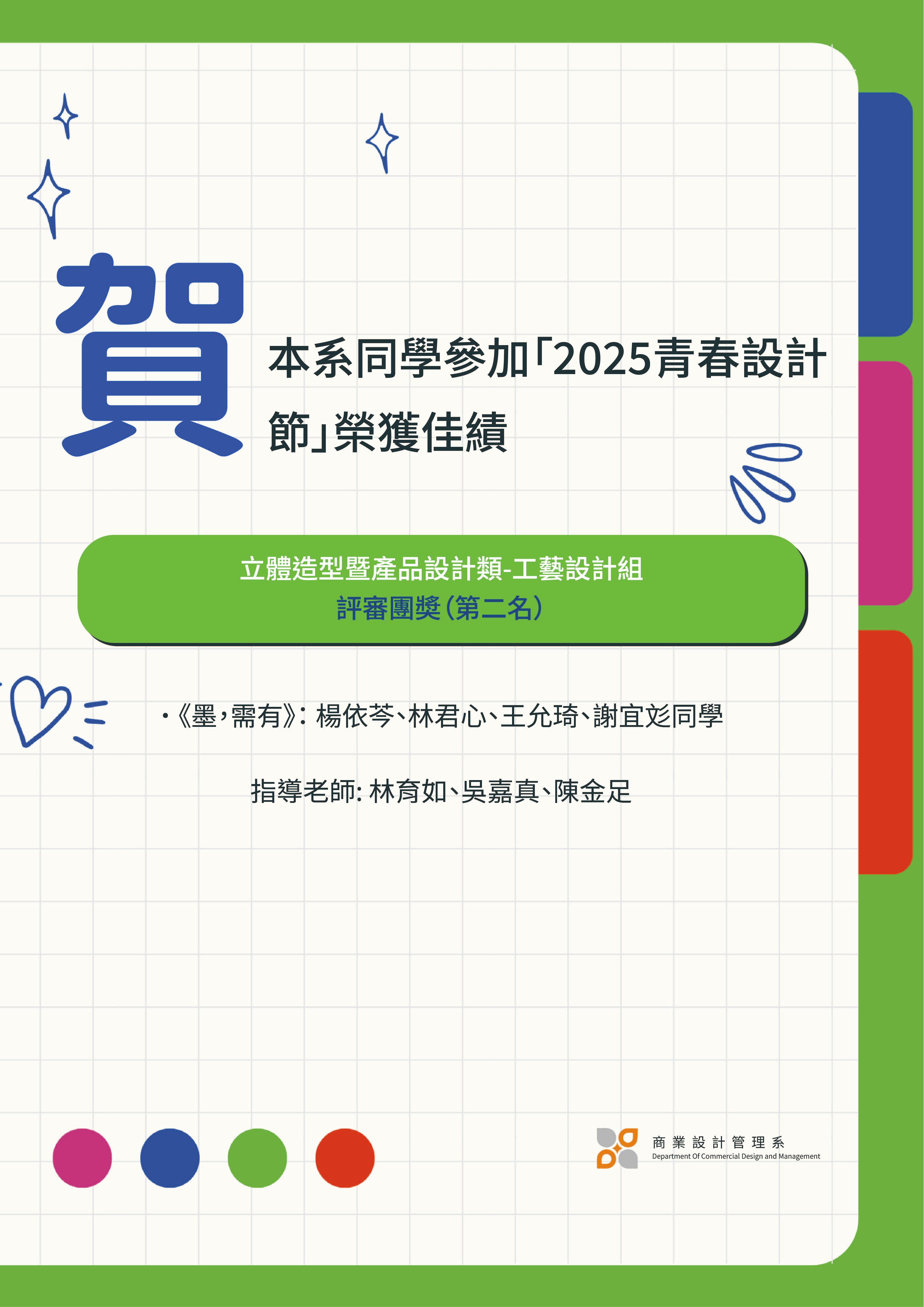 【賀】本系學生 專題製作作品「墨,虛有」獲得「青春設計節」立體造型暨產品設計類-工藝設計組-評審團奬(第二名)