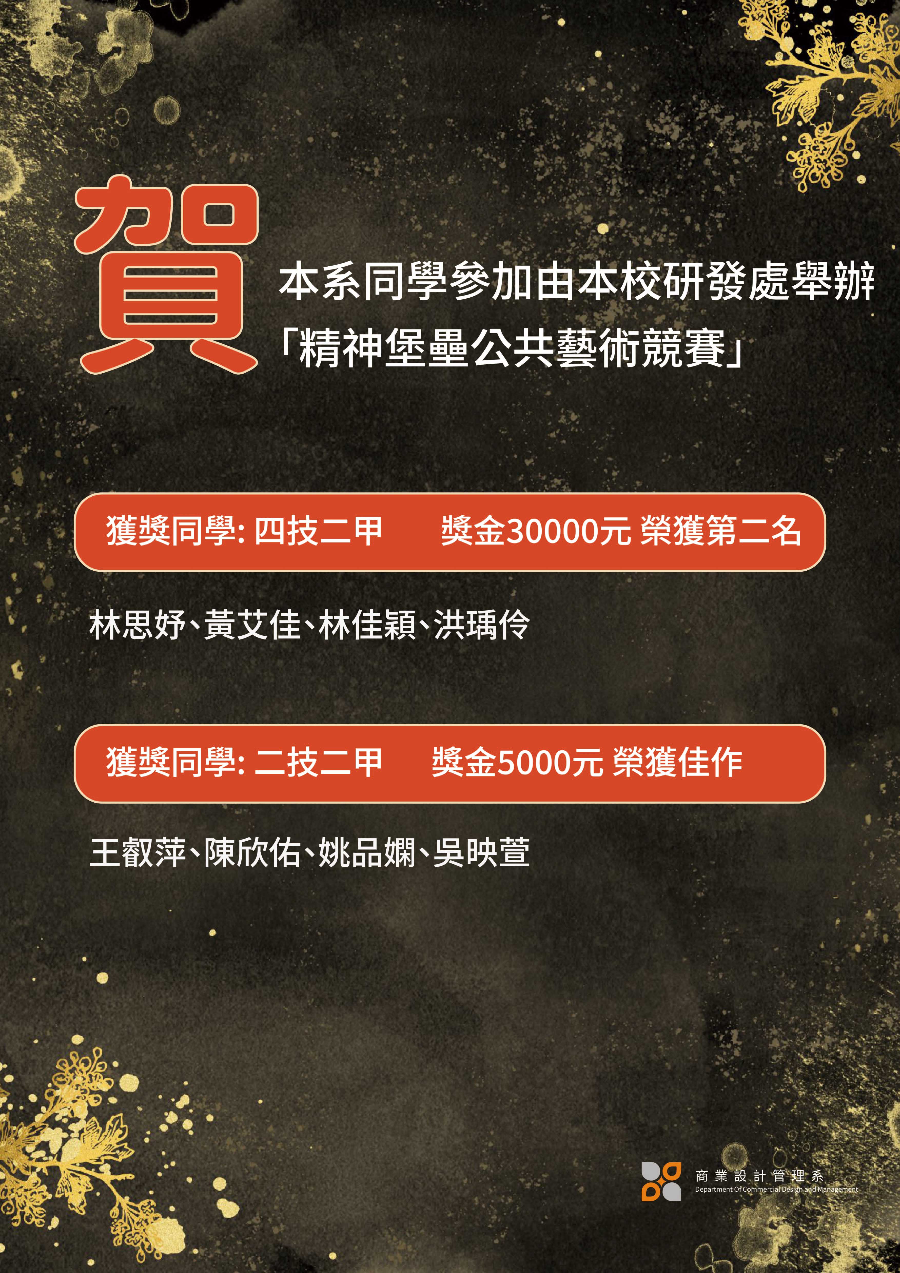 【賀】由本校研發處舉辦「精神堡壘公共藝術競賽」本系四技二甲代表林思妤同學榮獲第二名,獎金30000元;二技二甲代表王叡萍同學獲得佳作,獎金5000元