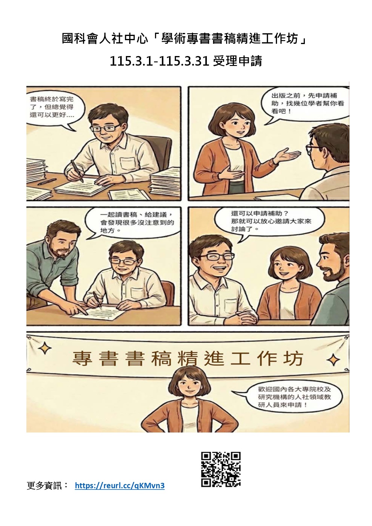 國家科學及技術委員會人文社會科學研究中心為提升學術性專書書稿之學術水準,特訂定補助學術專書書稿精進工作坊試辦方案。